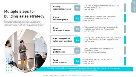 This slide provides glimpse about process of developing new and more effective sales strategy to boost profits and productivity. It includes steps such as develop organizational goals, create customer profile, sales strategies and tactics, hire and compensate sales team, etc. Are you searching for a Multiple Steps For Building Sales Strategy Business Sales Enhancement Campaign Sample Pdf that is uncluttered, straightforward, and original It is easy to edit, and you can change the colors to suit your personal or business branding. For a presentation that expresses how much effort you have put in, this template is ideal With all of its features, including tables, diagrams, statistics, and lists, it is perfect for a business plan presentation. Make your ideas more appealing with these professional slides. Download Multiple Steps For Building Sales Strategy Business Sales Enhancement Campaign Sample Pdf from Slidegeeks today. This slide provides glimpse about process of developing new and more effective sales strategy to boost profits and productivity. It includes steps such as develop organizational goals, create customer profile, sales strategies and tactics, hire and compensate sales team, etc.