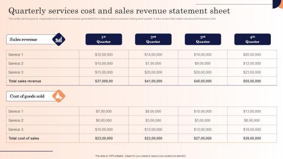 This slide can be used by organizations to represent revenue generated from sales of various services during each quarter. It also covers information about cost of services sold. This Quarterly Services Cost And Sales Revenue Strategic Marketing Campaign Download Pdf from Slidegeeks makes it easy to present information on your topic with precision. It provides customization options, so you can make changes to the colors, design, graphics, or any other component to create a unique layout. It is also available for immediate download, so you can begin using it right away. Slidegeeks has done good research to ensure that you have everything you need to make your presentation stand out. Make a name out there for a brilliant performance. This slide can be used by organizations to represent revenue generated from sales of various services during each quarter. It also covers information about cost of services sold.