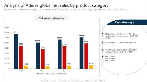 This slide provide the statistical data representing the overall sales of Adidas globally during the past four years. It compares the major selling products of Adidas that are footwear, apparel and hardware. The The Marketing Mix Of Analysis Of Adidas Global Net Sales By Product Category Strategy SS V is a compilation of the most recent design trends as a series of slides. It is suitable for any subject or industry presentation, containing attractive visuals and photo spots for businesses to clearly express their messages. This template contains a variety of slides for the user to input data, such as structures to contrast two elements, bullet points, and slides for written information. Slidegeeks is prepared to create an impression. This slide provide the statistical data representing the overall sales of Adidas globally during the past four years. It compares the major selling products of Adidas that are footwear, apparel and hardware.