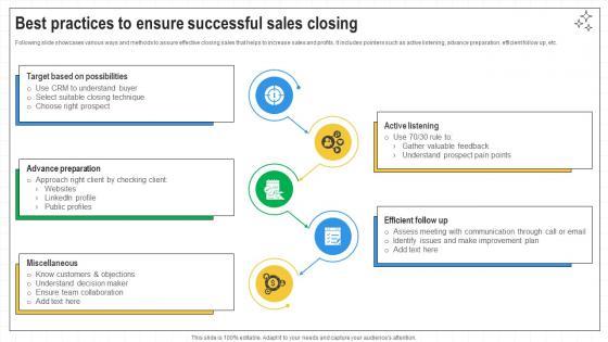 Following slide showcases various ways and methods to assure effective closing sales that helps to increase sales and profits. It includes pointers such as active listening, advance preparation, efficient follow up, etc. Slidegeeks is here to make your presentations a breeze with Closing Techniques To Seal Best Practices To Ensure Successful Sales Closing SA SS V With our easy-to-use and customizable templates, you can focus on delivering your ideas rather than worrying about formatting. With a variety of designs to choose from, you are sure to find one that suits your needs. And with animations and unique photos, illustrations, and fonts, you can make your presentation pop. So whether you are giving a sales pitch or presenting to the board, make sure to check out Slidegeeks first Following slide showcases various ways and methods to assure effective closing sales that helps to increase sales and profits. It includes pointers such as active listening, advance preparation, efficient follow up, etc.