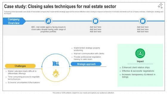 Following slide represents case study of real estate company that implemented strategic approach to ensure effective sales closing to improve conversions. It includes elements such as company overview, challenges, strategy and its impact. Find highly impressive Closing Techniques To Seal Case Study Closing Sales Techniques For Real Estate SA SS V on Slidegeeks to deliver a meaningful presentation. You can save an ample amount of time using these presentation templates. No need to worry to prepare everything from scratch because Slidegeeks experts have already done a huge research and work for you. You need to download Closing Techniques To Seal Case Study Closing Sales Techniques For Real Estate SA SS V for your upcoming presentation. All the presentation templates are 100 percent editable and you can change the color and personalize the content accordingly. Download now Following slide represents case study of real estate company that implemented strategic approach to ensure effective sales closing to improve conversions. It includes elements such as company overview, challenges, strategy and its impact.