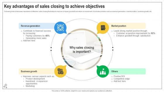 Following slide showcases importance of effective sales closing that helps to improve company goodwill and return on investment. It includes pointers such as revenue generation, market position, business growth, etc. Coming up with a presentation necessitates that the majority of the effort goes into the content and the message you intend to convey. The visuals of a PowerPoint presentation can only be effective if it supplements and supports the story that is being told. Keeping this in mind our experts created Closing Techniques To Seal Key Advantages Of Sales Closing To Achieve Objectives SA SS V to reduce the time that goes into designing the presentation. This way, you can concentrate on the message while our designers take care of providing you with the right template for the situation. Following slide showcases importance of effective sales closing that helps to improve company goodwill and return on investment. It includes pointers such as revenue generation, market position, business growth, etc.