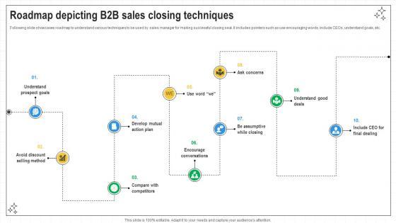Following slide showcases roadmap to understand various techniques to be used by sales manager for making successful closing seal. It includes pointers such as use encouraging words, include CEOs, understand goals, etc. Do you know about Slidesgeeks Closing Techniques To Seal Roadmap Depicting B2b Sales Closing Techniques SA SS V These are perfect for delivering any kind od presentation. Using it, create PowerPoint presentations that communicate your ideas and engage audiences. Save time and effort by using our pre-designed presentation templates that are perfect for a wide range of topic. Our vast selection of designs covers a range of styles, from creative to business, and are all highly customizable and easy to edit. Download as a PowerPoint template or use them as Google Slides themes. Following slide showcases roadmap to understand various techniques to be used by sales manager for making successful closing seal. It includes pointers such as use encouraging words, include CEOs, understand goals, etc.