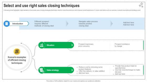 Following slide highlights implementation of accurate sales closing strategies that helps client to make final decision and improve overall experience. It covers elements such as overview, scenario examples and strategy used. Want to ace your presentation in front of a live audience Our Closing Techniques To Seal Select And Use Right Sales Closing Techniques SA SS V can help you do that by engaging all the users towards you. Slidegeeks experts have put their efforts and expertise into creating these impeccable powerpoint presentations so that you can communicate your ideas clearly. Moreover, all the templates are customizable, and easy-to-edit and downloadable. Use these for both personal and commercial use. Following slide highlights implementation of accurate sales closing strategies that helps client to make final decision and improve overall experience. It covers elements such as overview, scenario examples and strategy used.