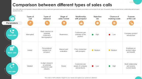 This slide outlines a comparison between different calling methods to generate leads and increase revenue. Includes parameters such as type of call, type of research, stage of sales funnel, relationship with prospect, rejection risk, etc. If your project calls for a presentation, then Slidegeeks is your go-to partner because we have professionally designed, easy-to-edit templates that are perfect for any presentation. After downloading, you can easily edit Ultimate Guide To Cold Comparison Between Different Types Of Sales Calls SA SS V and make the changes accordingly. You can rearrange slides or fill them with different images. Check out all the handy templates This slide outlines a comparison between different calling methods to generate leads and increase revenue. Includes parameters such as type of call, type of research, stage of sales funnel, relationship with prospect, rejection risk, etc.