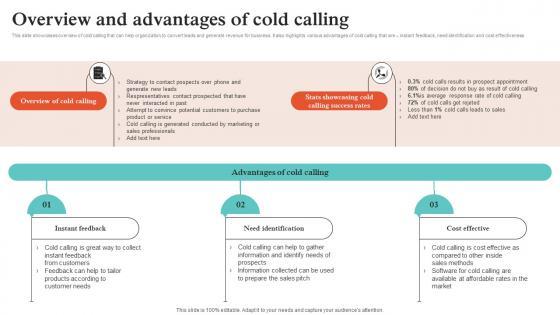This slide showcases overview of cold calling that can help organization to convert leads and generate revenue for business. It also highlights various advantages of cold calling that are instant feedback, need identification and cost effectiveness. Take your projects to the next level with our ultimate collection of Phone Sales Strategy To Drive Overview And Advantages Of Cold Calling Strategy SS V. Slidegeeks has designed a range of layouts that are perfect for representing task or activity duration, keeping track of all your deadlines at a glance. Tailor these designs to your exact needs and give them a truly corporate look with your own brand colors they will make your projects stand out from the rest This slide showcases overview of cold calling that can help organization to convert leads and generate revenue for business. It also highlights various advantages of cold calling that are instant feedback, need identification and cost effectiveness.