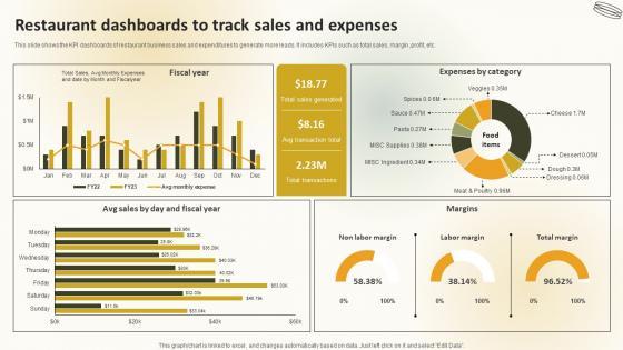 This slide shows the KPI dashboards of restaurant business sales and expenditures to generate more leads. It includes KPIs such as total sales, margin ,profit, etc. There are so many reasons you need a Create A Restaurant Marketing Restaurant Dashboards To Track Sales And Expenses. The first reason is you can not spend time making everything from scratch, Thus, Slidegeeks has made presentation templates for you too. You can easily download these templates from our website easily. This slide shows the KPI dashboards of restaurant business sales and expenditures to generate more leads. It includes KPIs such as total sales, margin ,profit, etc.