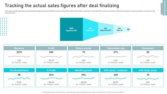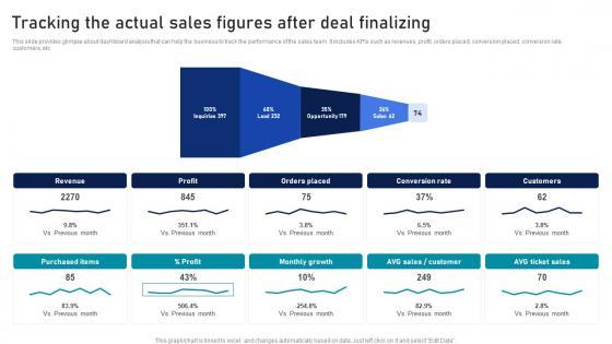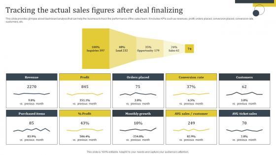This slide provides glimpse about dashboard analysis that can help the business to track the performance of the sales team. It includes KPIs such as revenues, profit, orders placed, conversion placed, conversion rate, customers, etc. Take your projects to the next level with our ultimate collection of Enhance Customer Retention Tracking The Actual Sales Figures After Deal Finalizing Graphics Pdf. Slidegeeks has designed a range of layouts that are perfect for representing task or activity duration, keeping track of all your deadlines at a glance. Tailor these designs to your exact needs and give them a truly corporate look with your own brand colors they well make your projects stand out from the rest. This slide provides glimpse about dashboard analysis that can help the business to track the performance of the sales team. It includes KPIs such as revenues, profit, orders placed, conversion placed, conversion rate, customers, etc.