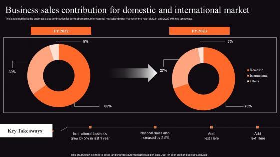 This slide highlights the business sales contribution for domestic market, international market and other market for the year of 2021 and 2022 with key takeaways. This modern and well arranged Food Processing Business Profile Business Sales Contribution For Domestic Designs Pdf provides lots of creative possibilities. It is very simple to customize and edit with the Powerpoint Software. Just drag and drop your pictures into the shapes. All facets of this template can be edited with Powerpoint, no extra software is necessary. Add your own material, put your images in the places assigned for them, adjust the colors, and then you can show your slides to the world, with an animated slide included. This slide highlights the business sales contribution for domestic market, international market and other market for the year of 2021 and 2022 with key takeaways.
