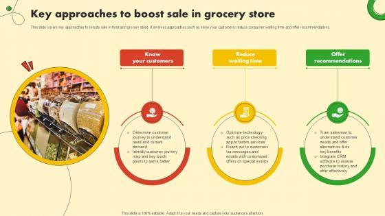 This slide covers key approaches to boosts sale in food and grocery store. It involves approaches such as know your customers, reduce consumer waiting time and offer recommendations. There are so many reasons you need a Key Approaches To Boost Sale In Food And Grocery Retail Ppt Presentation. The first reason is you can not spend time making everything from scratch, Thus, Slidegeeks has made presentation templates for you too. You can easily download these templates from our website easily. This slide covers key approaches to boosts sale in food and grocery store. It involves approaches such as know your customers, reduce consumer waiting time and offer recommendations.