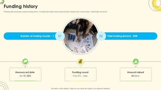 Following slide showcases company funding history. It includes information about announced date, funding round, amount raised , total funding amount etc. This modern and well-arranged Funding History Sales Pitch Deck For Online Retail Ppt Example provides lots of creative possibilities. It is very simple to customize and edit with the Powerpoint Software. Just drag and drop your pictures into the shapes. All facets of this template can be edited with Powerpoint, no extra software is necessary. Add your own material, put your images in the places assigned for them, adjust the colors, and then you can show your slides to the world, with an animated slide included. Following slide showcases company funding history. It includes information about announced date, funding round, amount raised , total funding amount etc.
