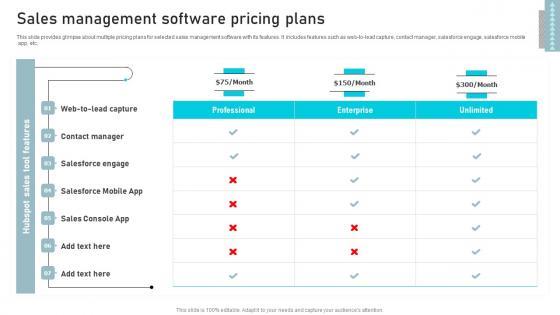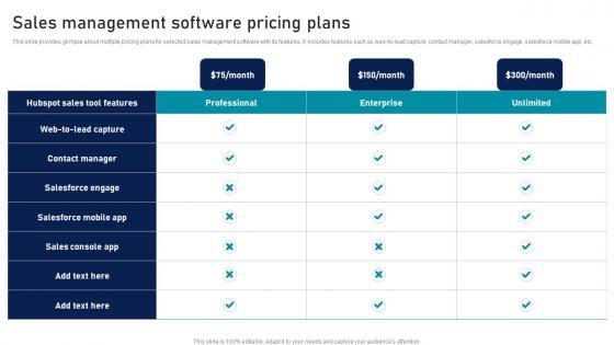 This slide provides glimpse about multiple pricing plans for selected sales management software with its features. It includes features such as web-to-lead capture, contact manager, salesforce engage, salesforce mobile app, etc. This Sales Management Software Pricing Plans Strategic Sales Plan To Enhance Topics Pdf from Slidegeeks makes it easy to present information on your topic with precision. It provides customization options, so you can make changes to the colors, design, graphics, or any other component to create a unique layout. It is also available for immediate download, so you can begin using it right away. Slidegeeks has done good research to ensure that you have everything you need to make your presentation stand out. Make a name out there for a brilliant performance. This slide provides glimpse about multiple pricing plans for selected sales management software with its features. It includes features such as web-to-lead capture, contact manager, salesforce engage, salesforce mobile app, etc.