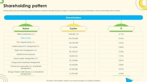 Here you can discover an assortment of the finest PowerPoint and Google Slides templates. With these templates, you can create presentations for a variety of purposes while simultaneously providing your audience with an eye-catching visual experience. Download Shareholding Pattern Sales Pitch Deck For Online Retail Ppt Template to deliver an impeccable presentation. These templates will make your job of preparing presentations much quicker, yet still, maintain a high level of quality. Slidegeeks has experienced researchers who prepare these templates and write high-quality content for you. Later on, you can personalize the content by editing the Shareholding Pattern Sales Pitch Deck For Online Retail Ppt Template Following slide showcases shareholding pattern that helps to understand ownership structure of company. It includes elements such as Shareholders, number and percentage share of equities.