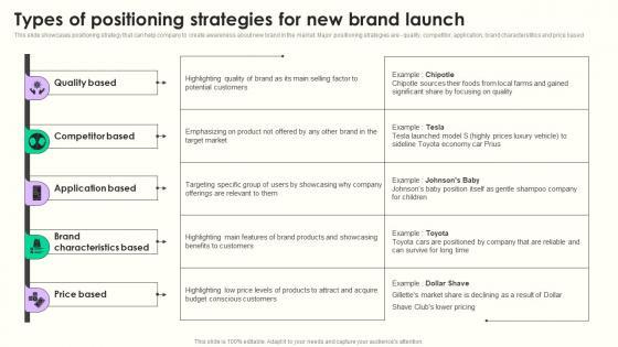 This slide showcases positioning strategy that can help company to create awareness about new brand in the market. Major positioning strategies are quality, competitor, application, brand characterstitics and price based Crafting an eye catching presentation has never been more straightforward. Let your presentation shine with this tasteful yet straightforward Types Of Positioning Strategies Maximizing Sales Via Online Brand Marketing Strategies Pictures Pdf template. It offers a minimalistic and classy look that is great for making a statement. The colors have been employed intelligently to add a bit of playfulness while still remaining professional. Construct the ideal Types Of Positioning Strategies Maximizing Sales Via Online Brand Marketing Strategies Pictures Pdf that effortlessly grabs the attention of your audience Begin now and be certain to wow your customers This slide showcases positioning strategy that can help company to create awareness about new brand in the market. Major positioning strategies are quality, competitor, application, brand characterstitics and price based