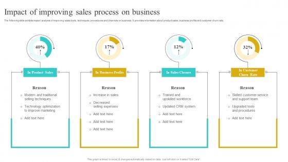 The following slide exhibits impact analysis of improving sales tools, techniques, procedures and channels on business. It provides information about product sales, business profits and customer churn rate. Slidegeeks is one of the best resources for PowerPoint templates. You can download easily and regulate Process Enhancement Plan To Boost Sales Performance Impact Of Improving Sales Process On Business Themes PDF for your personal presentations from our wonderful collection. A few clicks is all it takes to discover and get the most relevant and appropriate templates. Use our Templates to add a unique zing and appeal to your presentation and meetings. All the slides are easy to edit and you can use them even for advertisement purposes.