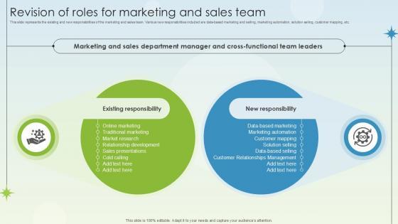 This slide represents the existing and new responsibilities of the marketing and sales team. Various new responsibilities included are data based marketing and selling, marketing automation, solution selling, customer mapping, etc. Boost your pitch with our creative Revision Of Roles For Marketing And Sales Team Business Growth Ppt Example. Deliver an awe-inspiring pitch that will mesmerize everyone. Using these presentation templates you will surely catch everyones attention. You can browse the ppts collection on our website. We have researchers who are experts at creating the right content for the templates. So you do not have to invest time in any additional work. Just grab the template now and use them. This slide represents the existing and new responsibilities of the marketing and sales team. Various new responsibilities included are data based marketing and selling, marketing automation, solution selling, customer mapping, etc.