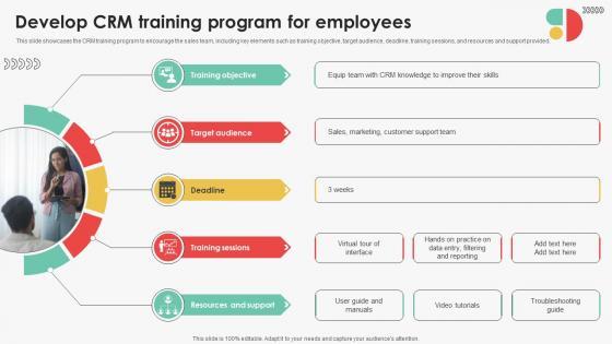 This slide showcases the CRM training program to encourage the sales team, including key elements such as training objective, target audience, deadline, training sessions, and resources and support provided. If your project calls for a presentation, then Slidegeeks is your go-to partner because we have professionally designed, easy-to-edit templates that are perfect for any presentation. After downloading, you can easily edit Develop CRM Training Program For Employees Efficient Sales Territory Management To Build SA SS V and make the changes accordingly. You can rearrange slides or fill them with different images. Check out all the handy templates This slide showcases the CRM training program to encourage the sales team, including key elements such as training objective, target audience, deadline, training sessions, and resources and support provided.