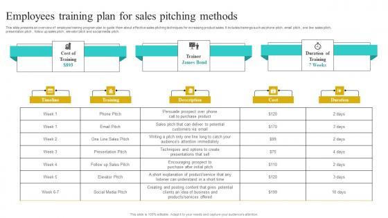 This slide presents an overview of employee training program plan to guide them about effective sales pitching techniques for increasing product sales. It includes trainings such as phone pitch, email pitch , one line sales pitch,presentation pitch , follow up sales pitch , elevator pitch and social media pitch.Slidegeeks is here to make your presentations a breeze with Employees Training Plan For Sales Pitching Methods Implementing Strategies To Improve Formats Pdf With our easy-to-use and customizable templates, you can focus on delivering your ideas rather than worrying about formatting. With a variety of designs to choose from, you are sure to find one that suits your needs. And with animations and unique photos, illustrations, and fonts, you can make your presentation pop. So whether you are giving a sales pitch or presenting to the board, make sure to check out Slidegeeks first. This slide presents an overview of employee training program plan to guide them about effective sales pitching techniques for increasing product sales. It includes trainings such as phone pitch, email pitch , one line sales pitch,presentation pitch , follow up sales pitch , elevator pitch and social media pitch.