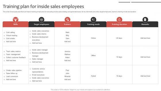 This slide showcases plan that can help to training employees for executing inside sales strategy and generate leads. Its key elements are skills, target employees, trainers, training mode and duration. Slidegeeks is here to make your presentations a breeze with Phone Sales Strategy To Drive Training Plan For Inside Sales Employees Strategy SS V With our easy-to-use and customizable templates, you can focus on delivering your ideas rather than worrying about formatting. With a variety of designs to choose from, you are sure to find one that suits your needs. And with animations and unique photos, illustrations, and fonts, you can make your presentation pop. So whether you are giving a sales pitch or presenting to the board, make sure to check out Slidegeeks first This slide showcases plan that can help to training employees for executing inside sales strategy and generate leads. Its key elements are skills, target employees, trainers, training mode and duration.