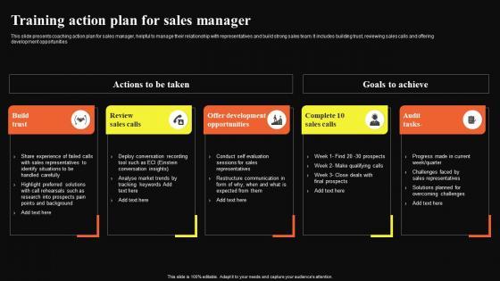 This slide presents coaching action plan for sales manager, helpful to manage their relationship with representatives and build strong sales team. It includes building trust, reviewing sales calls and offering development opportunities. Showcasing this set of slides titled Training Action Plan For Sales Manager Formats Pdf. The topics addressed in these templates are Offer Development Opportunities, Review Sales Calls. All the content presented in this PPT design is completely editable. Download it and make adjustments in color, background, font etc. as per your unique business setting. This slide presents coaching action plan for sales manager, helpful to manage their relationship with representatives and build strong sales team. It includes building trust, reviewing sales calls and offering development opportunities.