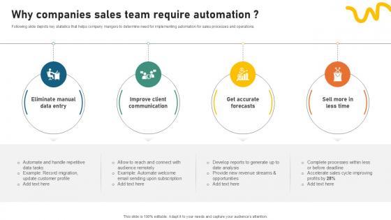 Following slide depicts key statistics that helps company mangers to determine need for implementing automation for sales processes and operations. This Why Companies Sales Team Sample Pitch Deck For Video Ppt Slide from Slidegeeks makes it easy to present information on your topic with precision. It provides customization options, so you can make changes to the colors, design, graphics, or any other component to create a unique layout. It is also available for immediate download, so you can begin using it right away. Slidegeeks has done good research to ensure that you have everything you need to make your presentation stand out. Make a name out there for a brilliant performance. Following slide depicts key statistics that helps company mangers to determine need for implementing automation for sales processes and operations.