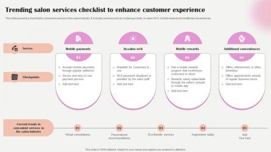 This slide presents a checklist for convenient services in the salon Industry. It includes services such as mobile payments, in-salon Wi-Fi, mobile rewards and additional conveniences. Are you searching for a Customizing The Salon Experience Trending Salon Services Checklist To Enhance Customer Strategy SS V that is uncluttered, straightforward, and original Its easy to edit, and you can change the colors to suit your personal or business branding. For a presentation that expresses how much effort you have put in, this template is ideal With all of its features, including tables, diagrams, statistics, and lists, its perfect for a business plan presentation. Make your ideas more appealing with these professional slides. Download Customizing The Salon Experience Trending Salon Services Checklist To Enhance Customer Strategy SS V from Slidegeeks today. This slide presents a checklist for convenient services in the salon Industry. It includes services such as mobile payments, in-salon Wi-Fi, mobile rewards and additional conveniences.