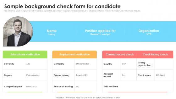 This slide shows sample background check form to analyse legal and educational history of applicant. It include sections such as educational verification, employment verification and criminal record check, etc. Find a pre-designed and impeccable Sample Background Check Form For Candidate Workforce Procurement And Aptitude Evaluation Ppt Presentation. The templates can ace your presentation without additional effort. You can download these easy-to-edit presentation templates to make your presentation stand out from others. So, what are you waiting for Download the template from Slidegeeks today and give a unique touch to your presentation. This slide shows sample background check form to analyse legal and educational history of applicant. It include sections such as educational verification, employment verification and criminal record check, etc.