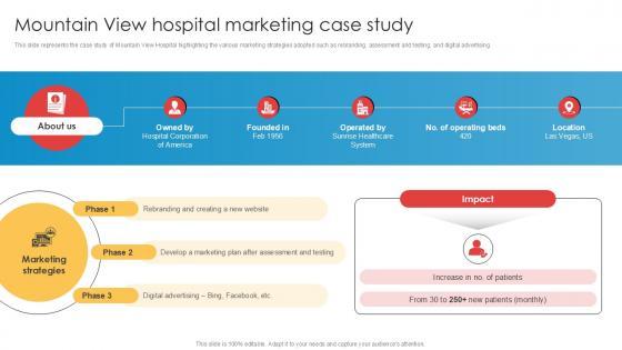 This slide represents the case study of Mountain View Hospital highlighting the various marketing strategies adopted such as rebranding, assessment and testing, and digital advertising. Create an editable Mountain View Hospital Marketing Case Study Implementation Of Online Ppt Sample that communicates your idea and engages your audience. Whether you are presenting a business or an educational presentation, pre-designed presentation templates help save time. Mountain View Hospital Marketing Case Study Implementation Of Online Ppt Sample is highly customizable and very easy to edit, covering many different styles from creative to business presentations. Slidegeeks has creative team members who have crafted amazing templates. So, go and get them without any delay. This slide represents the case study of Mountain View Hospital highlighting the various marketing strategies adopted such as rebranding, assessment and testing, and digital advertising.