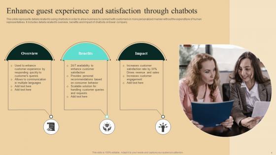 This slide represents details related to using chatbots in order to allow business to connect with customers in more personalized manner without the expenditure of human representatives. It includes details related to overview, benefits and impact of chatbots on travel company. Make sure to capture your audiences attention in your business displays with our gratis customizable Guide To Winning Tourism Enhance Guest Experience And Satisfaction Through Chatbots Inspiration Pdf These are great for business strategies, office conferences, capital raising or task suggestions. If you desire to acquire more customers for your tech business and ensure they stay satisfied, create your own sales presentation with these plain slides. This slide represents details related to using chatbots in order to allow business to connect with customers in more personalized manner without the expenditure of human representatives. It includes details related to overview, benefits and impact of chatbots on travel company.