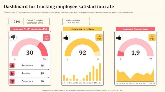 This slide covers KPI dashboard to measure employee satisfaction due to effective internal communication. It includes indicators such as net promoter score, retention rate, absenteeism etc. From laying roadmaps to briefing everything in detail, our templates are perfect for you. You can set the stage with your presentation slides. All you have to do is download these easy to edit and customizable templates. Dashboard For Tracking Employee Satisfaction Rate Ppt PowerPoint Presentation File Backgrounds PDF will help you deliver an outstanding performance that everyone would remember and praise you for. Do download this presentation today.