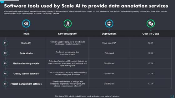 The following slide outlines various software tools used by company to offer annotation and labeling services to their clients. The tools mentioned in slide are Scale Application Programming Interface API, Scale studio, machine learning models, quality control software, and project management software. Do you have an important presentation coming up Are you looking for something that will make your presentation stand out from the rest Look no further than Implementing Scale AI Software Tools Used By Scale AI PPT Template AI SS V. With our professional designs, you can trust that your presentation will pop and make delivering it a smooth process. And with Slidegeeks, you can trust that your presentation will be unique and memorable. So why wait Grab Implementing Scale AI Software Tools Used By Scale AI PPT Template AI SS V today and make your presentation stand out from the rest The following slide outlines various software tools used by company to offer annotation and labeling services to their clients. The tools mentioned in slide are Scale Application Programming Interface API, Scale studio, machine learning models, quality control software, and project management software.