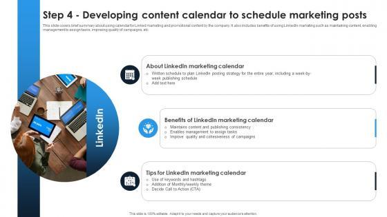 This slide covers brief summary about using calendar for Linked marketing and promotional content by the company. It also includes benefits of using LinkedIn marketing such as maintaining content, enabling management to assign tasks, improving quality of campaigns, etc. If your project calls for a presentation, then Slidegeeks is your go to partner because we have professionally designed, easy to edit templates that are perfect for any presentation. After downloading, you can easily edit Step 4 Developing Content Calendar To Schedule Marketing Posts Slides PDF and make the changes accordingly. You can rearrange slides or fill them with different images. Check out all the handy templates.