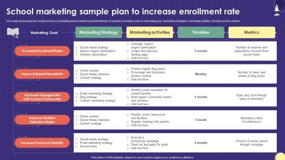 This slide showcases the sample of school marketing plan to enhance enrollment rate. It includes elements such as marketing goal, marketing strategies, marketing activities, timeline and its metrics. Do you have to make sure that everyone on your team knows about any specific topic I yes, then you should give School Marketing Sample Plan To Increase Enrollment School Enrollment Enhancement Strategy SS V a try. Our experts have put a lot of knowledge and effort into creating this impeccable School Marketing Sample Plan To Increase Enrollment School Enrollment Enhancement Strategy SS V. You can use this template for your upcoming presentations, as the slides are perfect to represent even the tiniest detail. You can download these templates from the Slidegeeks website and these are easy to edit. So grab these today This slide showcases the sample of school marketing plan to enhance enrollment rate. It includes elements such as marketing goal, marketing strategies, marketing activities, timeline and its metrics.