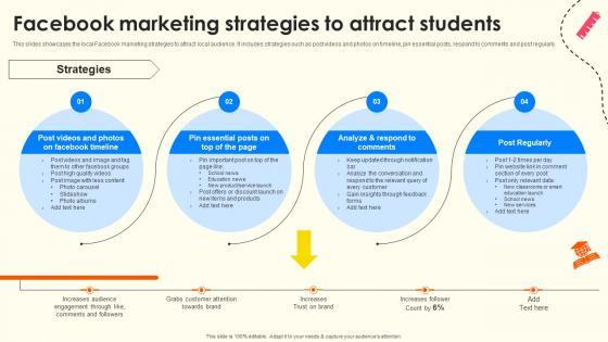 This slides showcases the local Facebook marketing strategies to attract local audience. It includes strategies such as post videos and photos on timeline, pin essential posts, respond to comments and post regularly. Slidegeeks is here to make your presentations a breeze with Facebook Marketing Strategies To Attract Students School Enrollment Enhancement Strategy SS V With our easy-to-use and customizable templates, you can focus on delivering your ideas rather than worrying about formatting. With a variety of designs to choose from, you are sure to find one that suits your needs. And with animations and unique photos, illustrations, and fonts, you can make your presentation pop. So whether you are giving a sales pitch or presenting to the board, make sure to check out Slidegeeks first This slides showcases the local Facebook marketing strategies to attract local audience. It includes strategies such as post videos and photos on timeline, pin essential posts, respond to comments and post regularly.