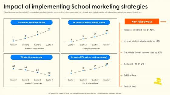 This slide showcases the impact of implementing marketing strategies on school. It includes improvement in enrollment rates, student retention rate, student turnover rate and return on investment. If your project calls for a presentation, then Slidegeeks is your go-to partner because we have professionally designed, easy-to-edit templates that are perfect for any presentation. After downloading, you can easily edit Impact Of Implementing School Marketing Strategies School Enrollment Enhancement Strategy SS V and make the changes accordingly. You can rearrange slides or fill them with different images. Check out all the handy templates This slide showcases the impact of implementing marketing strategies on school. It includes improvement in enrollment rates, student retention rate, student turnover rate and return on investment.
