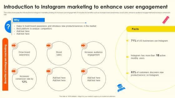 This slide showcases the introduction to Instagram marketing strategy to increase user engagement. It includes its benefits such as increase brand awareness, boost sales, enhance audience engagement and increase conversion rate. Crafting an eye-catching presentation has never been more straightforward. Let your presentation shine with this tasteful yet straightforward Introduction To Instagram Marketing To Enhance School Enrollment Enhancement Strategy SS V template. It offers a minimalistic and classy look that is great for making a statement. The colors have been employed intelligently to add a bit of playfulness while still remaining professional. Construct the ideal Introduction To Instagram Marketing To Enhance School Enrollment Enhancement Strategy SS V that effortlessly grabs the attention of your audience Begin now and be certain to wow your customers This slide showcases the introduction to Instagram marketing strategy to increase user engagement. It includes its benefits such as increase brand awareness, boost sales, enhance audience engagement and increase conversion rate.