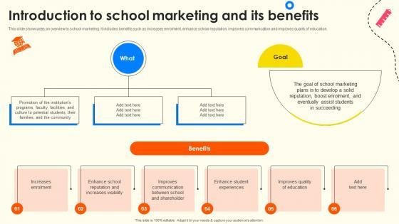 This slide showcases an overview to school marketing. It includes benefits such as increases enrolment, enhance school reputation, improves communication and improves quality of education. Make sure to capture your audiences attention in your business displays with our gratis customizable Introduction To School Marketing And Its Benefits School Enrollment Enhancement Strategy SS V. These are great for business strategies, office conferences, capital raising or task suggestions. If you desire to acquire more customers for your tech business and ensure they stay satisfied, create your own sales presentation with these plain slides. This slide showcases an overview to school marketing. It includes benefits such as increases enrolment, enhance school reputation, improves communication and improves quality of education.