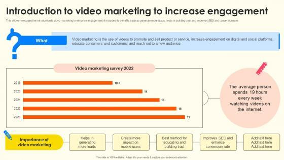 This slide showcases the introduction to video marketing to enhance engagement. It includes its benefits such as generate more leads, helps in building trust and improves SEO and conversion rate. Formulating a presentation can take up a lot of effort and time, so the content and message should always be the primary focus. The visuals of the PowerPoint can enhance the presenters message, so our Introduction To Video Marketing To Increase School Enrollment Enhancement Strategy SS V was created to help save time. Instead of worrying about the design, the presenter can concentrate on the message while our designers work on creating the ideal templates for whatever situation is needed. Slidegeeks has experts for everything from amazing designs to valuable content, we have put everything into Introduction To Video Marketing To Increase School Enrollment Enhancement Strategy SS V This slide showcases the introduction to video marketing to enhance engagement. It includes its benefits such as generate more leads, helps in building trust and improves SEO and conversion rate.