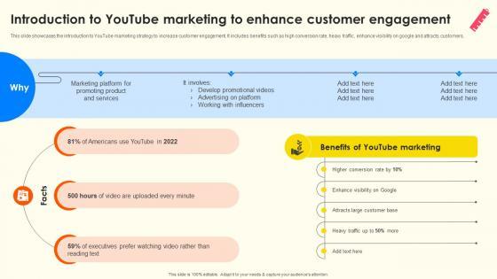 This slide showcases the introduction to YouTube marketing strategy to increase customer engagement. It includes benefits such as high conversion rate, heavy traffic, enhance visibility on google and attracts customers. Coming up with a presentation necessitates that the majority of the effort goes into the content and the message you intend to convey. The visuals of a PowerPoint presentation can only be effective if it supplements and supports the story that is being told. Keeping this in mind our experts created Introduction To Youtube Marketing To Enhance School Enrollment Enhancement Strategy SS V to reduce the time that goes into designing the presentation. This way, you can concentrate on the message while our designers take care of providing you with the right template for the situation. This slide showcases the introduction to YouTube marketing strategy to increase customer engagement. It includes benefits such as high conversion rate, heavy traffic, enhance visibility on google and attracts customers.