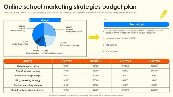 This slide showcases YouTube marketing Quarterly budget plan. It includes advertisements such as bumper ads, display ads, skippable ads, non-skippable ads and video discovery ads. Find a pre-designed and impeccable Online School Marketing Strategies Budget Plan School Enrollment Enhancement Strategy SS V. The templates can ace your presentation without additional effort. You can download these easy-to-edit presentation templates to make your presentation stand out from others. So, what are you waiting for. Download the template from Slidegeeks today and give a unique touch to your presentation. This slide showcases YouTube marketing Quarterly budget plan. It includes advertisements such as bumper ads, display ads, skippable ads, non-skippable ads and video discovery ads.