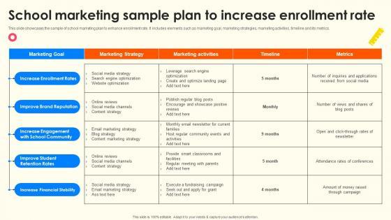 This slide showcases the sample of school marketing plan to enhance enrollment rate. It includes elements such as marketing goal, marketing strategies, marketing activities, timeline and its metrics. Do you have to make sure that everyone on your team knows about any specific topic I yes, then you should give School Marketing Sample Plan To Increase Enrollment School Enrollment Enhancement Strategy SS V a try. Our experts have put a lot of knowledge and effort into creating this impeccable School Marketing Sample Plan To Increase Enrollment School Enrollment Enhancement Strategy SS V. You can use this template for your upcoming presentations, as the slides are perfect to represent even the tiniest detail. You can download these templates from the Slidegeeks website and these are easy to edit. So grab these today This slide showcases the sample of school marketing plan to enhance enrollment rate. It includes elements such as marketing goal, marketing strategies, marketing activities, timeline and its metrics.