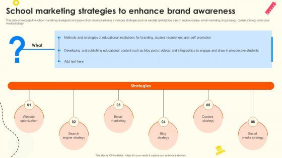 This slide showcases the school marketing strategies to increase school brand awareness. It includes strategies such as website optimization, search engine strategy, email marketing, blog strategy, content strategy and social media strategy. Get a simple yet stunning designed School Marketing Strategies To Enhance Brand School Enrollment Enhancement Strategy SS V. It is the best one to establish the tone in your meetings. It is an excellent way to make your presentations highly effective. So, download this PPT today from Slidegeeks and see the positive impacts. Our easy-to-edit School Marketing Strategies To Enhance Brand School Enrollment Enhancement Strategy SS V can be your go-to option for all upcoming conferences and meetings. So, what are you waiting for. Grab this template today. This slide showcases the school marketing strategies to increase school brand awareness. It includes strategies such as website optimization, search engine strategy, email marketing, blog strategy, content strategy and social media strategy.