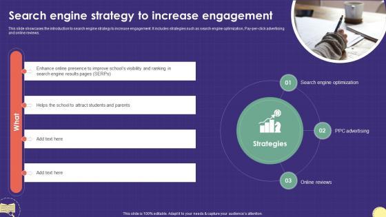 This slide showcases the introduction to search engine strategy to increase engagement. It includes strategies such as search engine optimization, Pay-per-click advertising and online reviews. Present like a pro with Search Engine Strategy To Increase Engagement Marketing Plan For Boosting School Strategy SS V. Create beautiful presentations together with your team, using our easy-to-use presentation slides. Share your ideas in real-time and make changes on the fly by downloading our templates. So whether youre in the office, on the go, or in a remote location, you can stay in sync with your team and present your ideas with confidence. With Slidegeeks presentation got a whole lot easier. Grab these presentations today. This slide showcases the introduction to search engine strategy to increase engagement. It includes strategies such as search engine optimization, Pay-per-click advertising and online reviews.