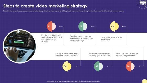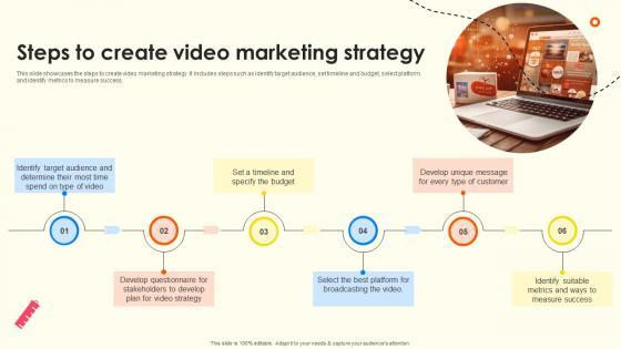 This slide showcases the steps to create video marketing strategy. It includes steps such as identify target audience, set timeline and budget, select platform and identify metrics to measure success. Find highly impressive Steps To Create Video Marketing Strategy Marketing Plan For Boosting School Strategy SS V on Slidegeeks to deliver a meaningful presentation. You can save an ample amount of time using these presentation templates. No need to worry to prepare everything from scratch because Slidegeeks experts have already done a huge research and work for you. You need to download Steps To Create Video Marketing Strategy Marketing Plan For Boosting School Strategy SS V for your upcoming presentation. All the presentation templates are 100 percent editable and you can change the color and personalize the content accordingly. Download now This slide showcases the steps to create video marketing strategy. It includes steps such as identify target audience, set timeline and budget, select platform and identify metrics to measure success.