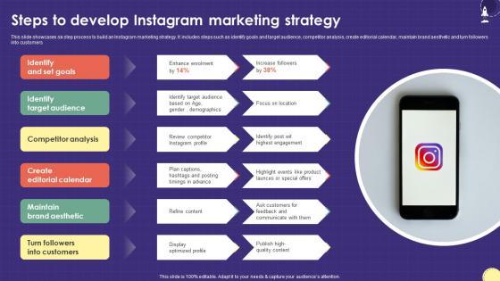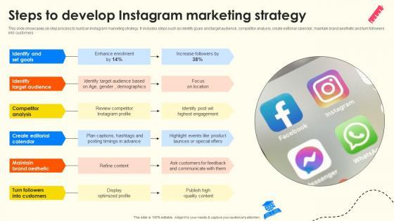 This slide showcases six step process to build an Instagram marketing strategy. It includes steps such as identify goals and target audience, competitor analysis, create editorial calendar, maintain brand aesthetic and turn followers into customers. If your project calls for a presentation, then Slidegeeks is your go-to partner because we have professionally designed, easy-to-edit templates that are perfect for any presentation. After downloading, you can easily edit Steps To Develop Instagram Marketing Strategy School Enrollment Enhancement Strategy SS V and make the changes accordingly. You can rearrange slides or fill them with different images. Check out all the handy templates This slide showcases six step process to build an Instagram marketing strategy. It includes steps such as identify goals and target audience, competitor analysis, create editorial calendar, maintain brand aesthetic and turn followers into customers