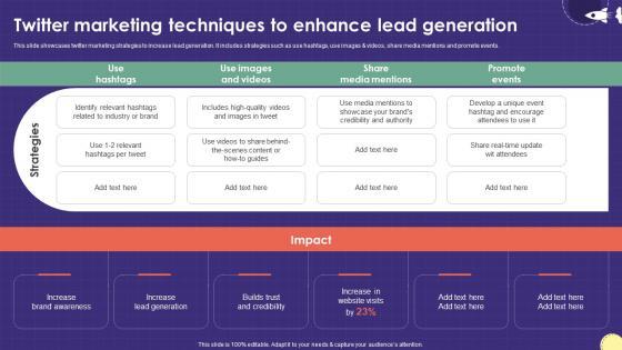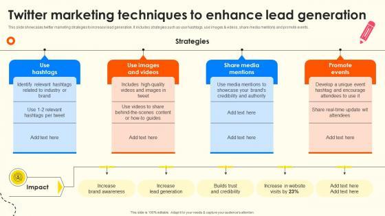 This slide showcases twitter marketing strategies to increase lead generation. It includes strategies such as use hashtags, use images and videos, share media mentions and promote events. Crafting an eye-catching presentation has never been more straightforward. Let your presentation shine with this tasteful yet straightforward Twitter Marketing Techniques To Enhance Marketing Plan For Boosting School Strategy SS V template. It offers a minimalistic and classy look that is great for making a statement. The colors have been employed intelligently to add a bit of playfulness while still remaining professional. Construct the ideal Twitter Marketing Techniques To Enhance Marketing Plan For Boosting School Strategy SS V that effortlessly grabs the attention of your audience Begin now and be certain to wow your customers This slide showcases twitter marketing strategies to increase lead generation. It includes strategies such as use hashtags, use images and videos, share media mentions and promote events.