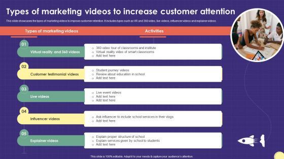 This slide showcases the types of marketing videos to improve customer retention. It includes types such as VR and 360 video, live videos, influencer videos and explainer videos. Welcome to our selection of the Types Of Marketing Videos To Increase Customer Attention School Enrollment Enhancement Strategy SS V. These are designed to help you showcase your creativity and bring your sphere to life. Planning and Innovation are essential for any business that is just starting out. This collection contains the designs that you need for your everyday presentations. All of our PowerPoints are 100 percent editable, so you can customize them to suit your needs. This multi-purpose template can be used in various situations. Grab these presentation templates today. This slide showcases the types of marketing videos to improve customer retention. It includes types such as VR and 360 video, live videos, influencer videos and explainer videos.