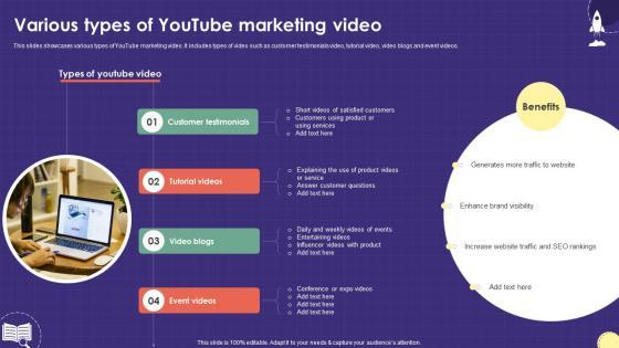 This slides showcases various types of YouTube marketing video. It includes types of video such as customer testimonials video, tutorial video, video blogs and event videos. Welcome to our selection of the Various Types Of Youtube Marketing Video Marketing Plan For Boosting School Strategy SS V. These are designed to help you showcase your creativity and bring your sphere to life. Planning and Innovation are essential for any business that is just starting out. This collection contains the designs that you need for your everyday presentations. All of our PowerPoints are 100 percent editable, so you can customize them to suit your needs. This multi-purpose template can be used in various situations. Grab these presentation templates today. This slides showcases various types of YouTube marketing video. It includes types of video such as customer testimonials video, tutorial video, video blogs and event videos.