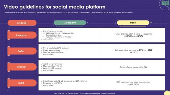 This slide showcases the video instructions or guidelines for social media platform. It includes channels such as Instagram, Twitter, Pinterest, TikTok and its guidelines and some facts. Explore a selection of the finest Video Guidelines For Social Media Platform Marketing Plan For Boosting School Strategy SS V here. With a plethora of professionally designed and pre-made slide templates, you can quickly and easily find the right one for your upcoming presentation. You can use our Video Guidelines For Social Media Platform Marketing Plan For Boosting School Strategy SS V to effectively convey your message to a wider audience. Slidegeeks has done a lot of research before preparing these presentation templates. The content can be personalized and the slides are highly editable. Grab templates today from Slidegeeks. This slide showcases the video instructions or guidelines for social media platform. It includes channels such as Instagram, Twitter, Pinterest, TikTok and its guidelines and some facts.