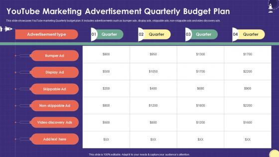 This slide showcases YouTube marketing Quarterly budget plan. It includes advertisements such as bumper ads, display ads, skippable ads, non-skippable ads and video discovery ads. This Youtube Marketing Advertisement Marketing Plan For Boosting School Strategy SS V is perfect for any presentation, be it in front of clients or colleagues. It is a versatile and stylish solution for organizing your meetings. The Youtube Marketing Advertisement Marketing Plan For Boosting School Strategy SS V features a modern design for your presentation meetings. The adjustable and customizable slides provide unlimited possibilities for acing up your presentation. Slidegeeks has done all the homework before launching the product for you. So, do not wait, grab the presentation templates today This slide showcases YouTube marketing Quarterly budget plan. It includes advertisements such as bumper ads, display ads, skippable ads, non-skippable ads and video discovery ads.